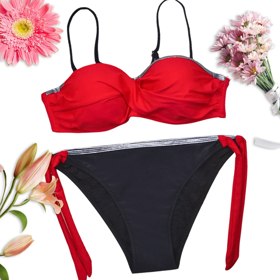 Special Price for Red Women Bandeau Bikini Set Push Up Swimsuit Sexy Padded Europe Female Swimwear Summer Beachwear B